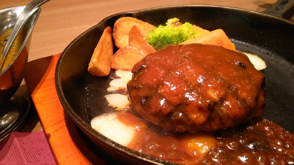 鉄板に乗ってジュワジュワ言いながら、ソースも鉄板ではじけて湯気までファーファ―出ていて、”すっげーうまそう”って、その状況をそのまま感じたままにカメラで撮ろうとしたんだけど、ファーファ―とハンバーグから立ち込める湯気が写真には写らなかった…。